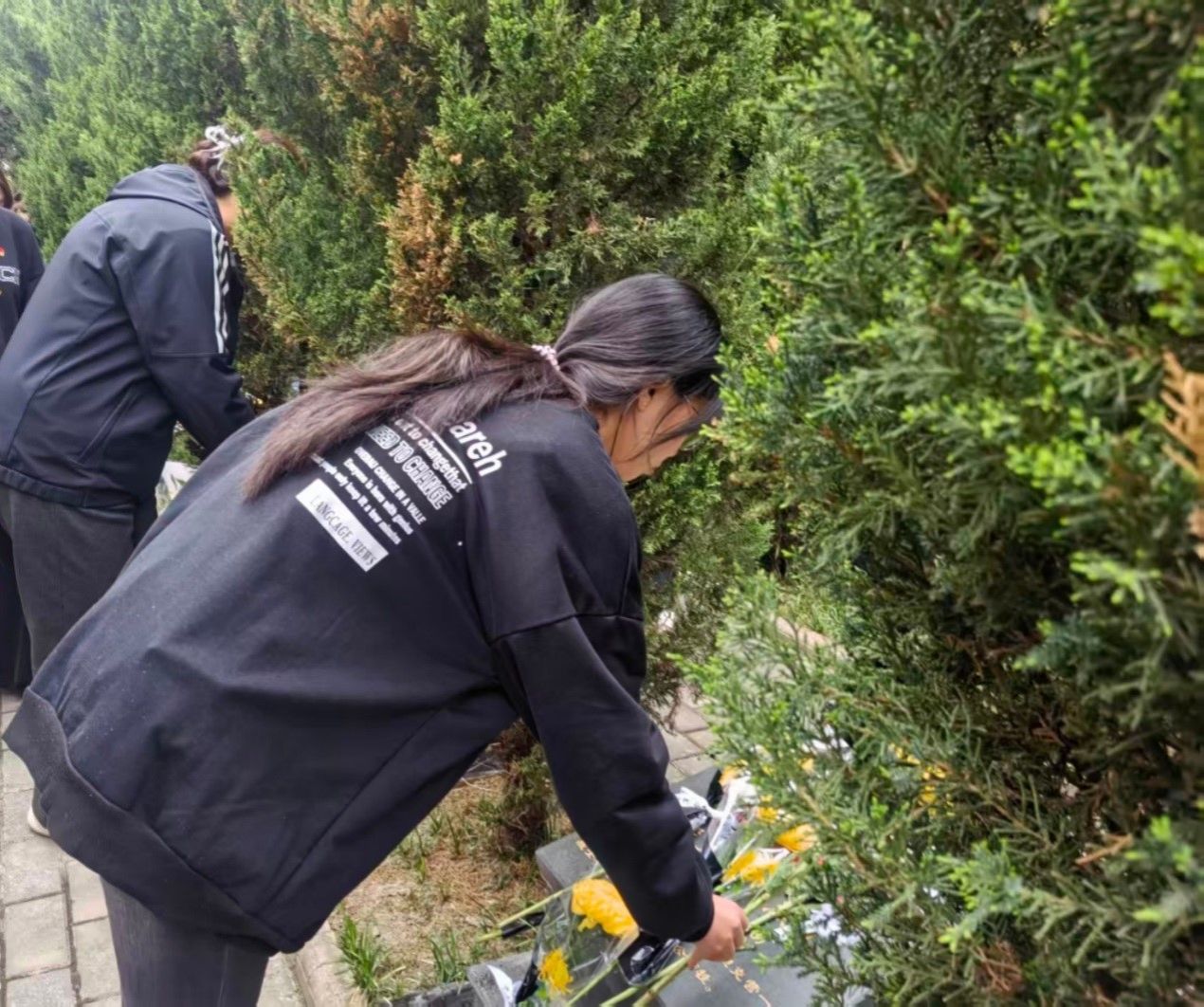在重温入党誓词环节,全体党员面对党旗,高举右拳,庄严宣誓,铿锵誓言在陵园上空回荡,彰显了青年党员不忘初心、牢记使命的坚定信念。随后,全体学生在领誓人带领下,面向烈士纪念碑集体宣誓:“铭记历史,感恩奋进;学好专业,报效祖国;强国有我,请党放心!”字字铿锵,句句有力,表达了新时代青年奋发有为、报效祖国的坚定决心。在祭奠瞻仰环节,全体师生缓步绕行烈士纪念碑,俯身擦拭墓碑,敬献鲜花,表达对英烈的崇高敬意和无限追思。活动最后,全体人员在纪念碑前合影留念。