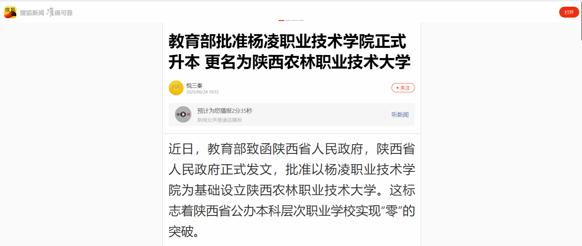 近日,教育部致函陕西省人民政府,陕西省人民政府正式发文,批准以杨凌职业技术学院为基础设立陕西农林职业技术大学。这标志着陕西省公办本科层次职业学校实现“零”的突破。
