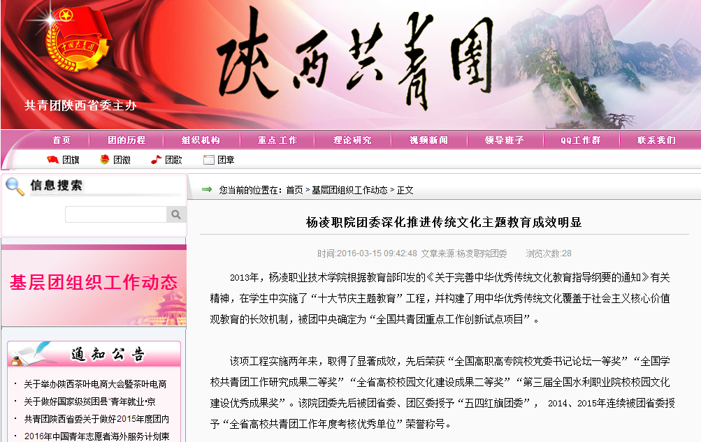2013年,杨凌职业技术学院根据教育部印发的《关于完善中华优秀传统文化教育指导纲要的通知》有关精神,在学生中实施了“十大节庆主题教育”工程,并构建了用中华优秀传统文化覆盖于社会主义核心价值观教育的长效机制,被团中央确定为“全国共青团重点工作创新试点项目”。