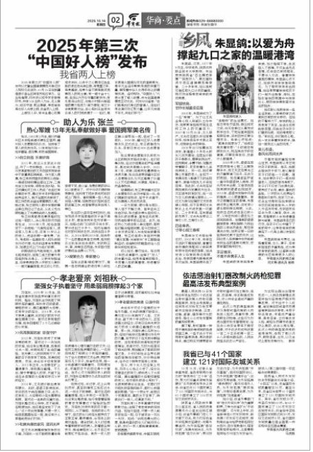 朱显鸽用爱与责任,诠释着军嫂、女儿、妻子、母亲和姐姐的多重角色,成为孝老爱亲的典范,让温暖与美德的光芒照亮更多人的心田。