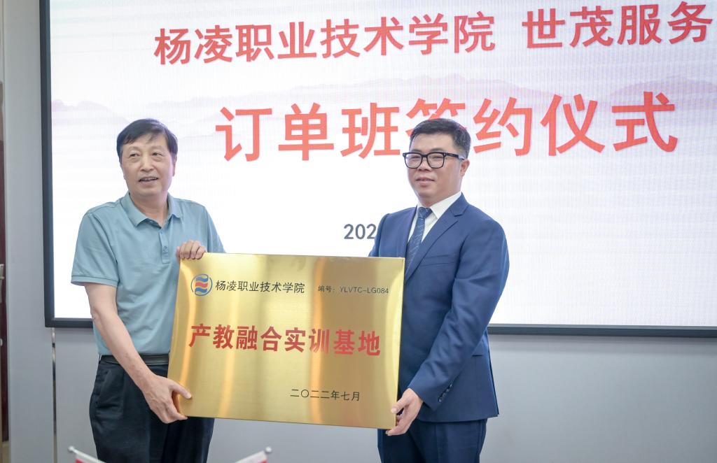 7月28日,我校“世茂服务”订单班签约仪式举行。副校长祝战斌与世茂服务西北中心城市公司总经理周兵代表校企双方签订了订单培养协议,并向企业授予“产教融合实训基地”牌子;周兵向学校授予“现代物业管理专业人才培养基地”牌子;校企双方互聘兼职老师与岗位技能培训师。