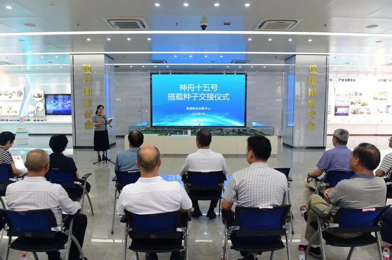 7月 28 日,神舟十五号搭载种子交接仪式在杨凌国际种业大厦举行。交接仪式上,杨凌示范区党工委委员、管委会副主任马江涛向我校副校长祝战斌移交了由学校培育的在太空遨游了186天的小麦育种材料“武农981”“杨职99”和“杨职111”,并颁发公证证书。