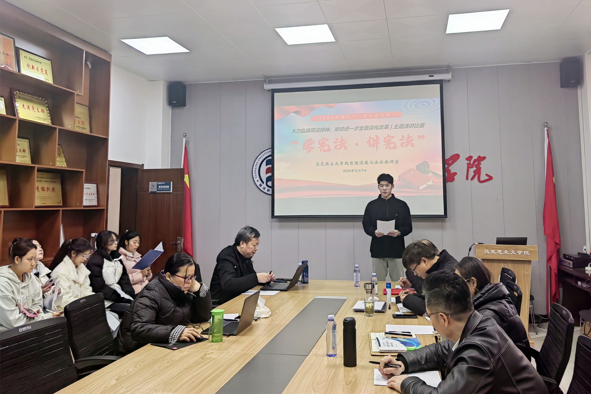 ——举行演讲比赛。129日,马克思主义学院举行“学宪法·讲宪法”主题演讲比赛。经过前期宣传动员、遴选推荐等环节,18位学生选手参加了现场决赛。选手们结合自身学习经历和感悟,用鲜明的观点、生动的事例、真切的情感,声情并茂地展示了对宪法的认识和理解,抒发了对建设法治中国的美好愿景。