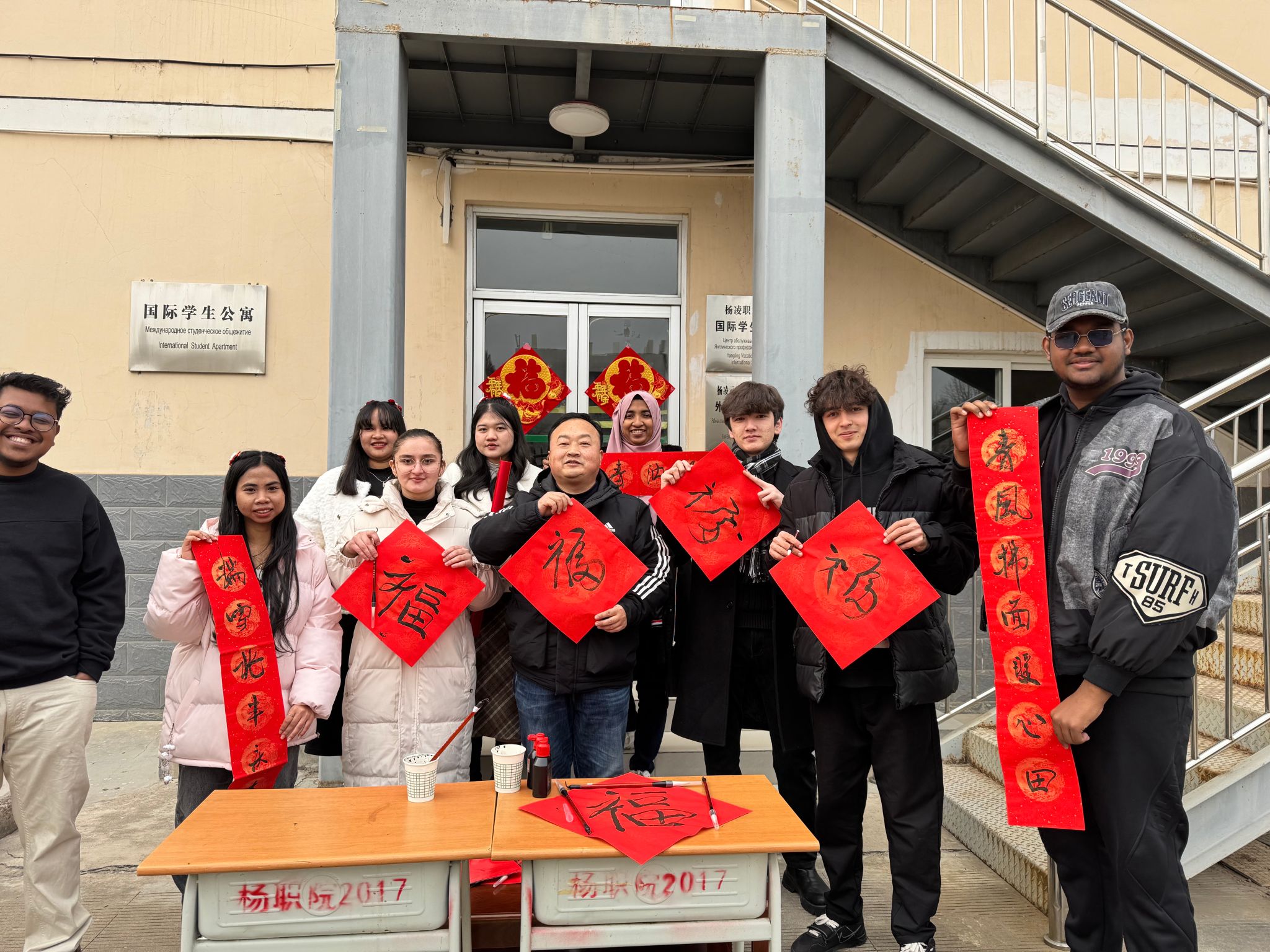 春节前夕,由国际学院教师带队,组织开展研学活动。国际学生们在研学之旅中参观了上合组织现代农业交流中心和后稷教稼园,在中国古代农业、现代农业、当代农业和未来农业中驻足、流连忘返、沉浸其中。春节期间,国际学生拿起毛笔,蘸上墨汁,在老师指导下,神情专注、一笔一划地写下“福”字,将对新年的美好期许融入字里行间。大家围坐一起,品尝传统饺子,走上街头在杨凌老街道感受中国春节民俗。国际学院将继续致力于服务学校国际化发展,推动学校国际化办学更细更实。