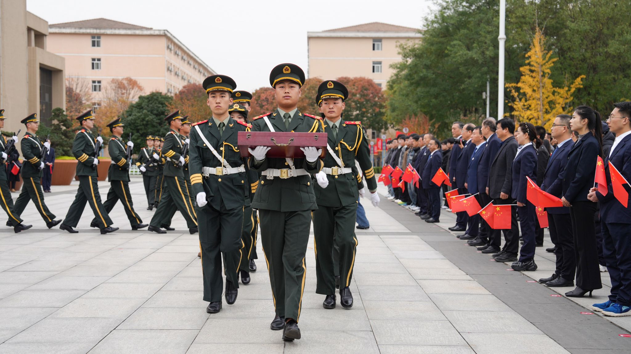 国旗护卫队将天安门国旗护送至校史馆陈列珍藏