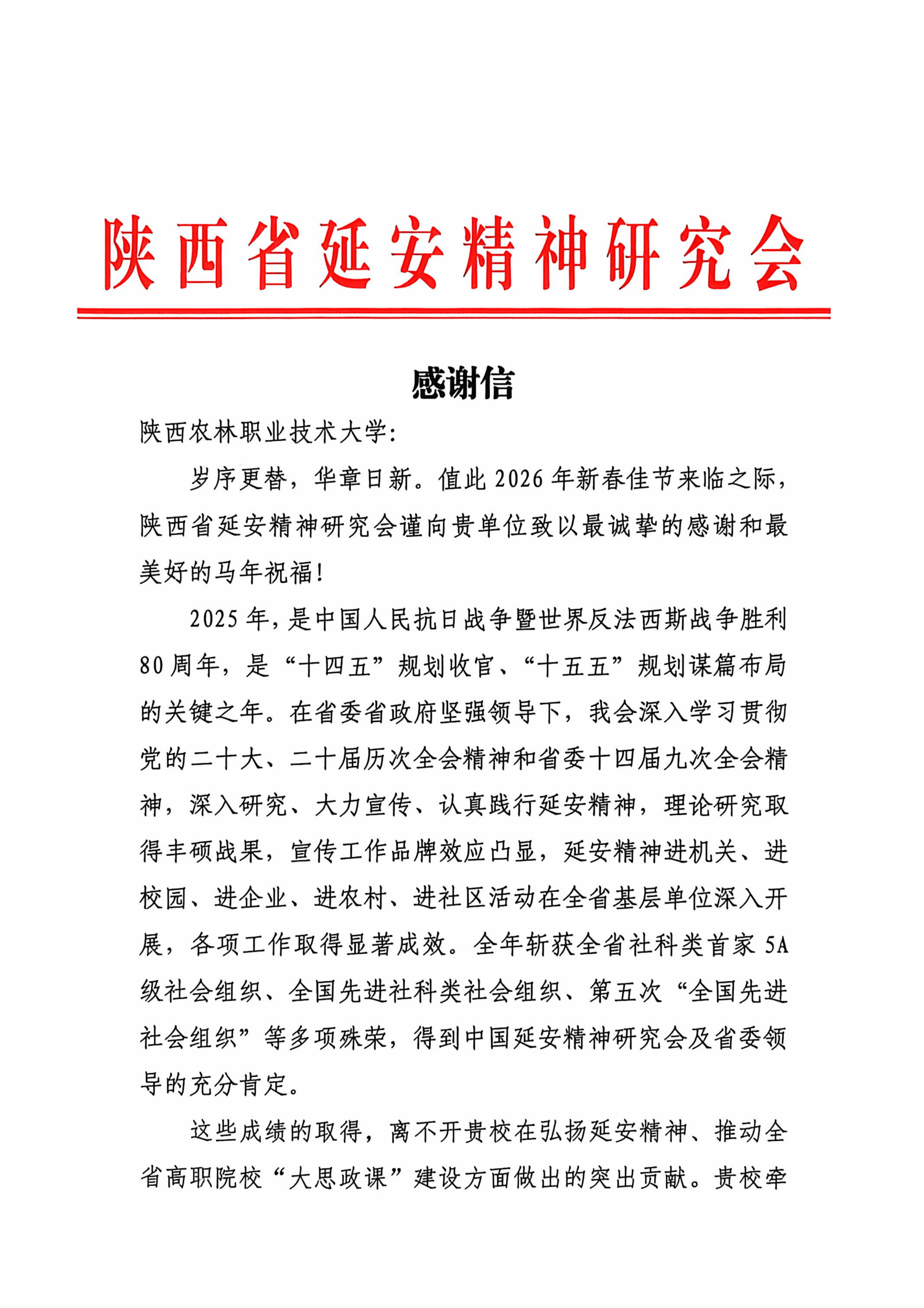 感谢信首先介绍了2025年陕西省延安精神研究会取得的各项工作成效,并表示这些成绩的取得离不开学校的鼎力支持。学校牵头成立陕西高职院校“大思政课”建设协同发展联盟,吸纳研究会为特别理事长单位,还联合研究会、陕西广电融媒体集团主办《从延安再出发》大思政课,为延安精神融入高职思政教育开辟新路径,产生广泛社会影响。