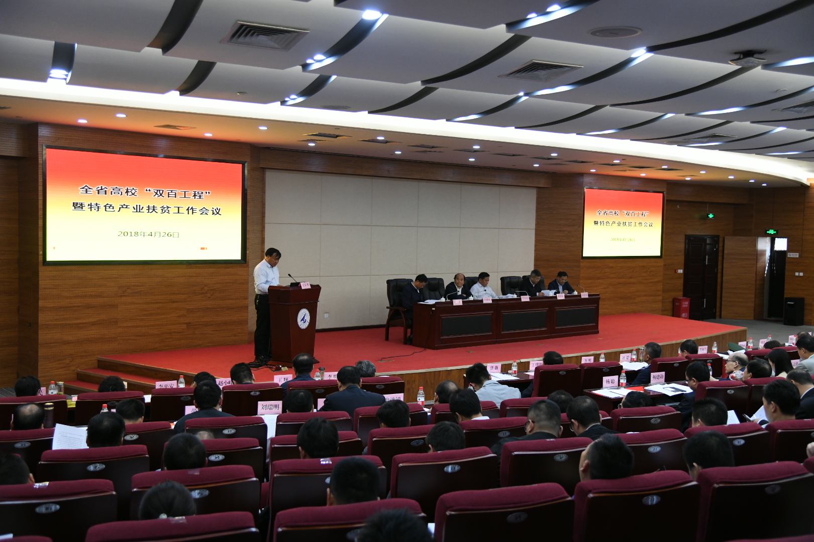 4月26日下午,全省高校“双百工程”暨特色产业扶贫工作会在西北工业大学召开,省委高教工委书记董小龙、副书记李智军、副巡视员高巍、省扶贫开发办公室副主任丁纪民、省教育厅副厅长、高教局副局长刘建林出席会议,省教育厅总会计师刘宝平、财务处、高教处、科技处负责同志、全省103所高校主要负责同志及扶贫工作相关负责人参加会议。
