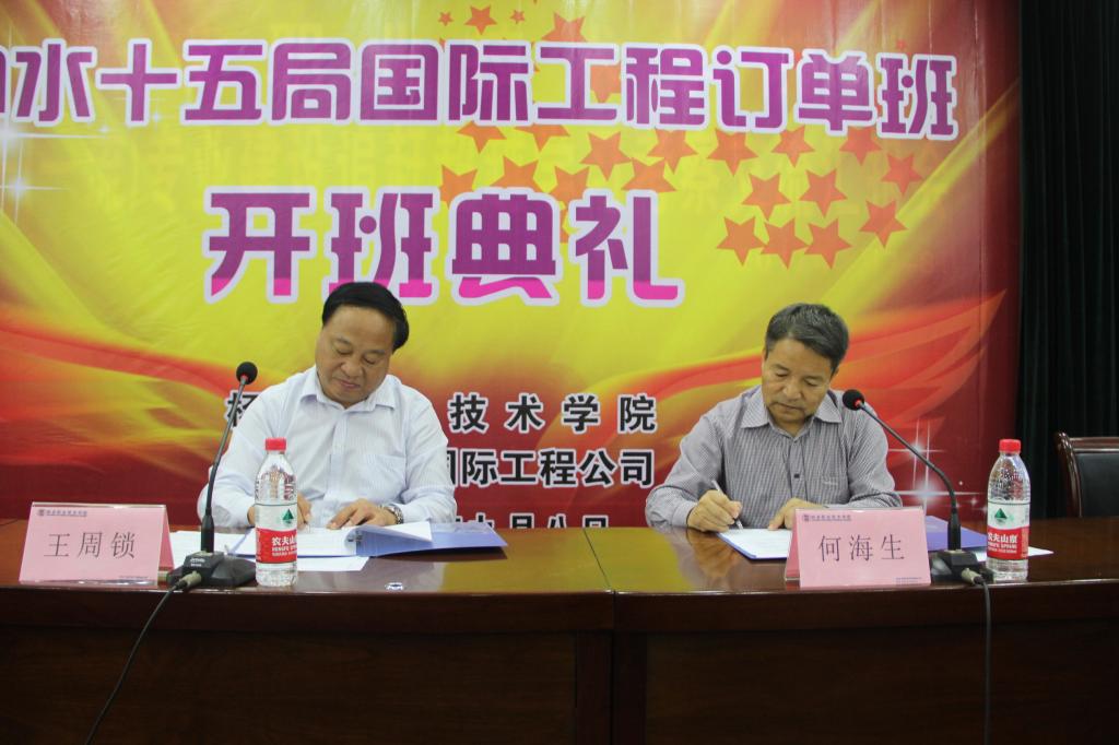 会上,王周锁和何海生代表双方签订订单班协议书。根据协议,我院在2015级水利类及2015级路桥专业中设立中水十五局国际工程订单班(以下简称“订单班”),该班计划选拔40名左右学生。我院和中水十五局双方共同制定“订单班”人才培养方案,在师资、技术、设备、场地、信息等办学资源方面进行合作,共同组织教学,学期期满后,该“订单班”学生就业由中水十五局优先择优录用,并与录用学生签订就业协议。