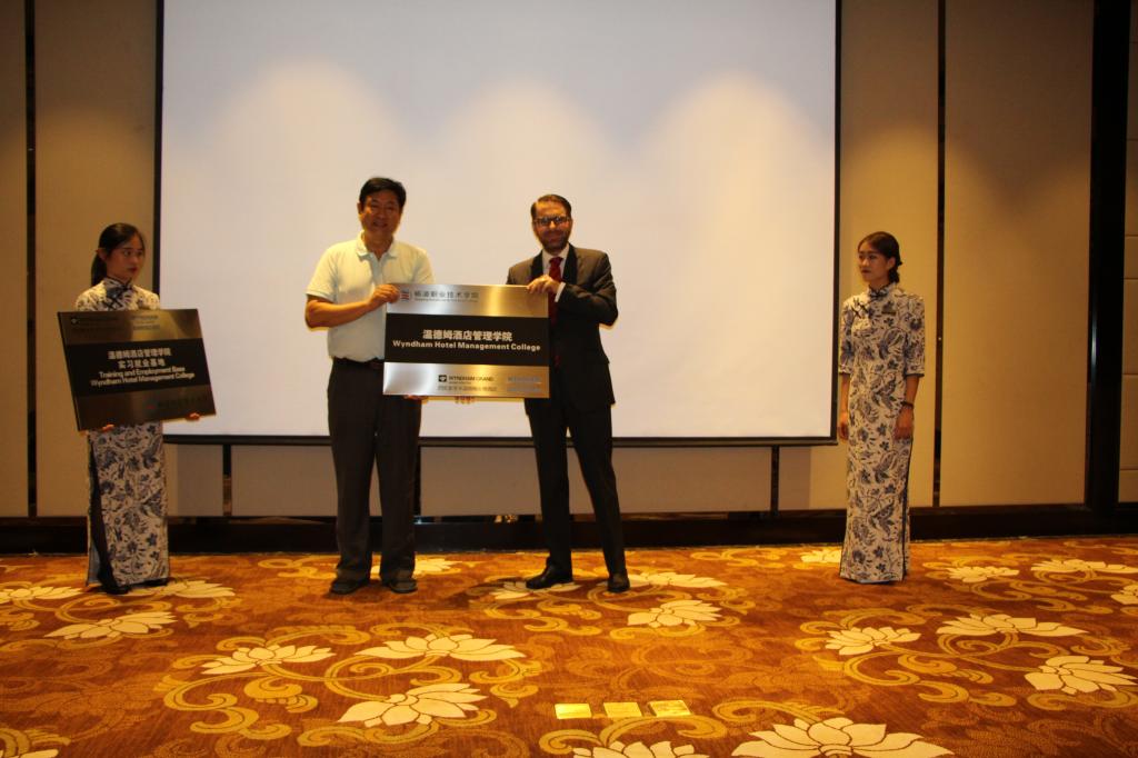随后,Flank王晓地分别代表双方签署校企合作协议,并互授“温德姆酒店管理学院”和“温德姆酒店管理学院实习就业基地”的牌匾拜存有Flank分别为酒店部门经理和旅管分院部分教师颁发“兼职教师”和“企业培训导师”聘书。学院实习生进行了工作制服展示,轻松愉快、精彩纷呈的展示将会场气氛推向了又一个高潮。