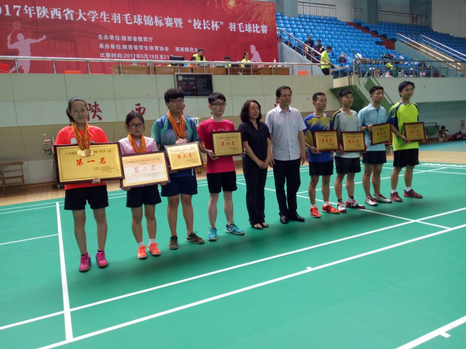 5 月21日 ,2017年陕西省大学生羽毛球锦标赛暨“校长杯”比赛在陕西省师范大学圆满落幕。本次比赛由省教育厅主办,省学生体育协会、陕西省师范大学共同承办,比赛历时两天,来自全省40多所高校的校级领导以及学生运动员共600余名组队参赛。本次比赛共有11支高职院校报名参赛。