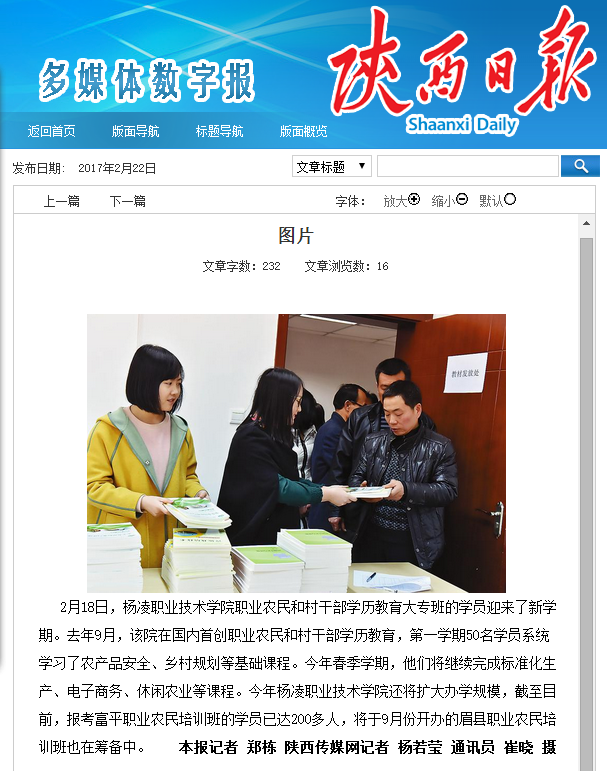 2月18日,杨凌职业技术学院职业农民和村干部学历教育大专班的学员迎来了新学期。去年9月,该院在国内首创职业农民和村干部学历教育,第一学期50名学员系统学习了农产品安全、乡村规划等基础课程。今年春季学期,他们将继续完成标准化生产、电子商务、休闲农业等课程。今年杨凌职业技术学院还将扩大办学规模,截至目前,报考富平职业农民培训班的学员已达200多人,将于9月份开办的眉县职业农民培训班也在筹备中。