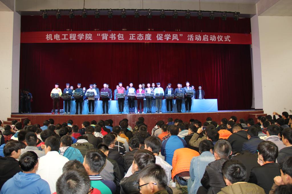 11月14日下午,机电工程分院在南校区一卡通中心举行“背书包、正态度、促学风”活动启动仪式,机电工程分院党总支书记,分院院长,全体辅导员、班主任、部分专业教师及2016级875名同学共同参加了启动仪式。