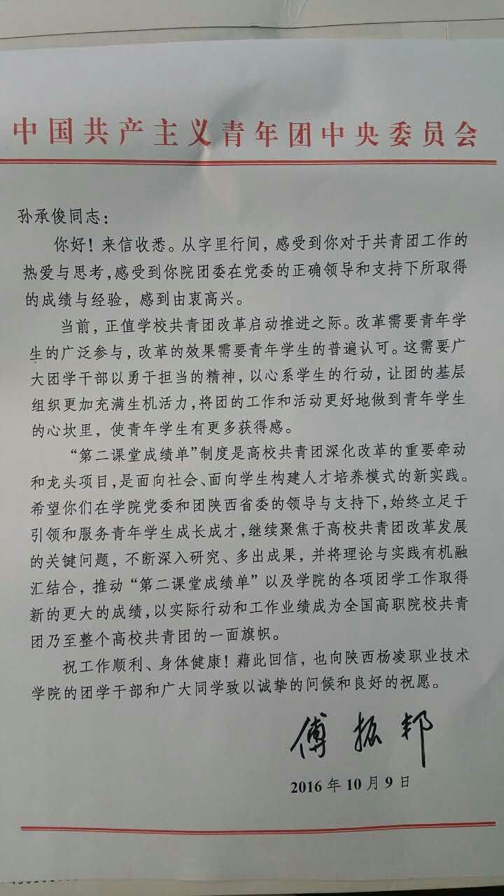 傅振邦同志的来信,为我院团学干部带来了强劲的动力。共青团杨凌职业技术学院委员会希望各级团学组织和团学干部,要大力实施“十大节庆”主题教育活动,弘扬和传承中华优秀传统文化,大力培育和践行社会主义核心价值观。大力实施“学生社团百千万建设”工程,促进学生个性发展。大力实施《大学生第二课堂成绩单》,打好学生综合素质培养组合拳。工作中,要持续发功、久久为功,与时俱进、勇立潮头,不忘初心、继续前行,在建成全国一流职业大学的宏伟征程中建功立业。