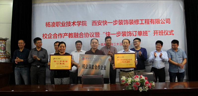 张迪副院长对快一步公司的到来表示欢迎,他代表学院与快一步公司徐金诚总经理签署了校企合作产教融合协议,并向快一步公司授予了校企深度合作牌匾,快一步公司向我院授予了快一步人才培养基地及快一步装饰订单班牌匾。