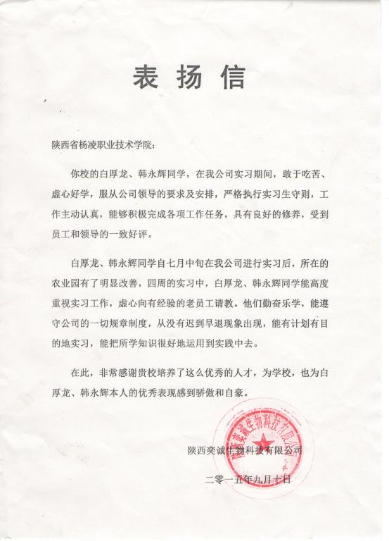 近日,陕西奕诚生物科技有限公司给我院发来表扬信。今年暑期,生态环境工程分院林业技术专业2013级学生白厚龙、韩永辉在陕西奕诚生物科技有限公司实习,实习期间立足岗位,不怕苦、不怕累,出色完成实习任务,受到用人单位的高度肯定。