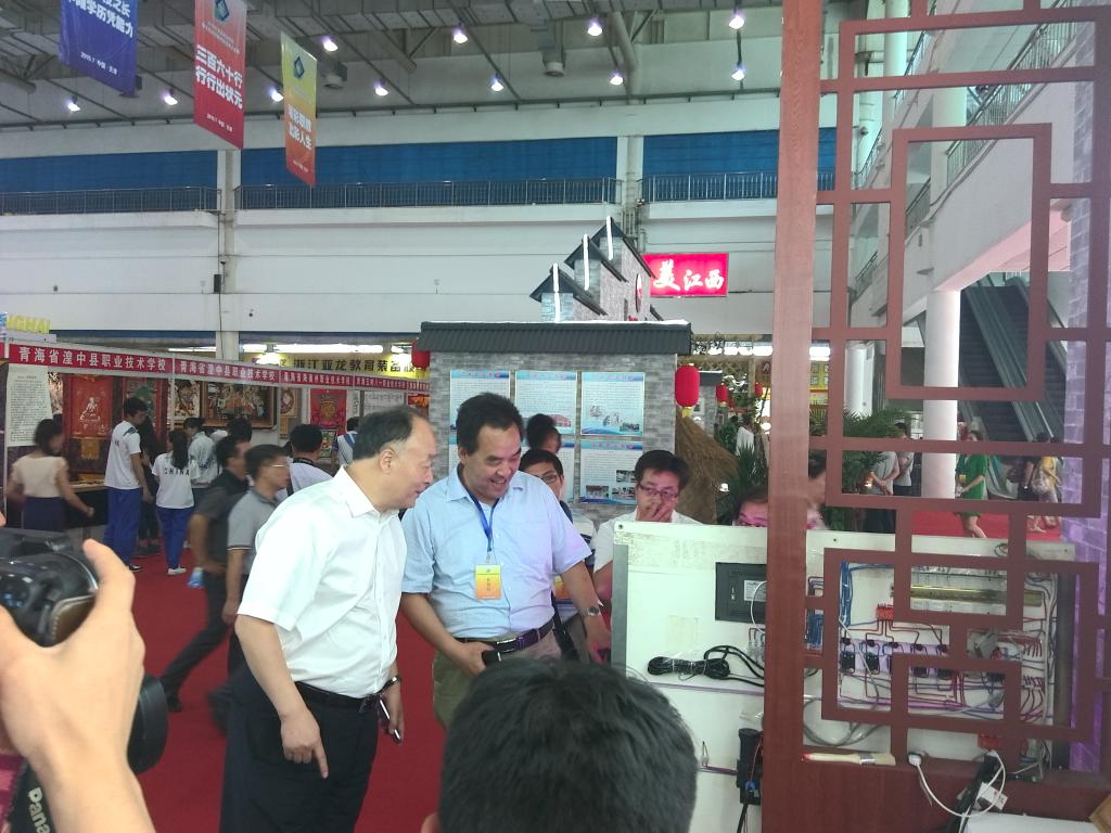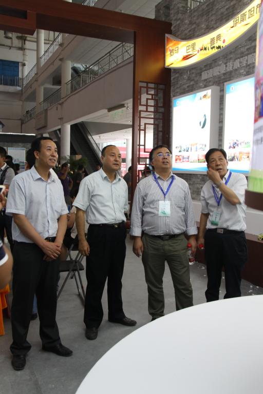 党委书记赵曼(左二)、副院长张永良(左一)陪同省教育厅学位委员会秘书长袁宁(右二)、职成处处长韩忠诚(右一)  检查指导陕西展馆布展工作