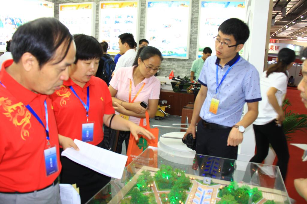 我院指导教师(右一)向组委会评委专家介绍“杨凌文化广场景观设计沙盘”作品