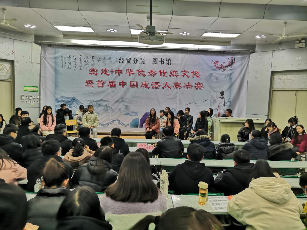 12月17日晚,经济与贸易分院与图书馆联合举行“党建+中华优秀传统文化”暨首届中国成语大赛决赛。图书馆馆长王红相、文理分院院长王云江、经贸分院党总支书记李嘉鸣、副院长郑伟出席活动,从初赛的62名选手中选拔出的30名选手参加了比赛,大一、大二学生代表共计200余人观看了比赛。