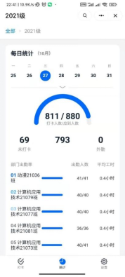 10月28日早上7:10时,早操刚刚结束,信息工程学院钉钉APP即时统计页面显示,大一学生早操出勤率为96%,大二学生早操出勤率比上半年增加将近20%,该学院本学期以来实施新的早操管理制度取得明显效果。