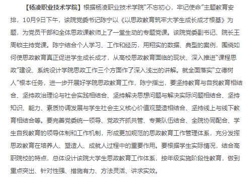 【杨凌职业技术学院】根据杨凌职业技术学院“不忘初心、牢记使命”主题教育安排,10月9日下午,该院党委书记陈宁以《以思政教育筑牢大学生成长成才根基》为题,为党员干部和全体思政课教师上了一堂生动的专题党课。该院党委副书记、院长王周锁主持党课。陈宁结合个人学习、工作和经历,用翔实的数据、典型的案例,围绕如何使思政教育真正促进学生成长成才,从高校思政教育面临的现状、深入推进“课程思政”建设、系统设计学院思政工作三个方面作了深入浅出的讲解。就全面落实“立德树人”根本任务,进一步开展好学院思政教育工作,陈宁指出,要坚持教育与自我教育相结合、坚持政治理论与社会实践相结合、坚持解决思想问题与解决实际问题相结合、坚持知识、能力、素质协调发展与学生社会主义核心价值观塑造相结合、坚持线上与线下教育相结合等。要完善党委统一领导、党政齐抓共管、专兼队伍结合、全院协同配合、学生自我教育的领导体制和工作机制,形成更加规范的思政教育工作管理体系,充分发挥思政教育在培养人、塑造人、成就人过程中的重要作用。要根据学生实际情况,结合高职院校的特点,总体设计该院大学生思政教育工作体系,按年级实施阶段性教育,做到重点突出、针对性强、措施有力、方法灵活、讲求实效。