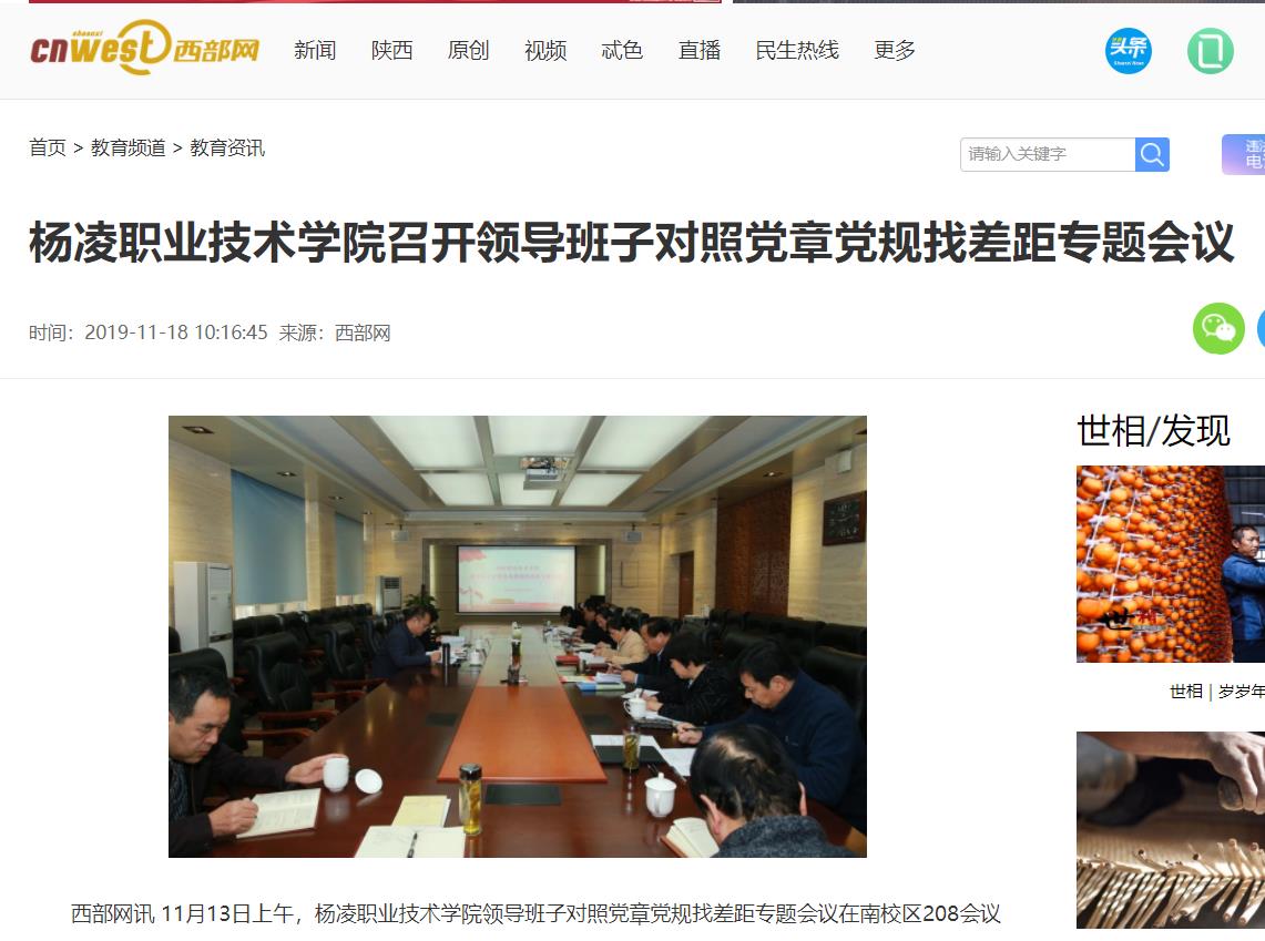 西部网讯 11月13日上午,杨凌职业技术学院领导班子对照党章党规找差距专题会议在南校区208会议室召开。委厅“不忘初心、牢记使命”主题教育第一巡回指导组成员到会指导。
