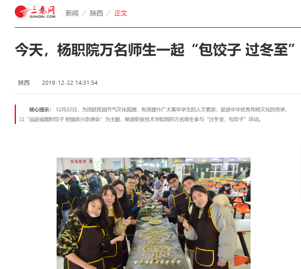 三秦都市报—三秦网讯(记者 薛保华 孙建恒 通讯员 陆敏)12月22日,为活跃校园节气文化氛围,有效提升广大青年学生的人文素质,促进中华优秀传统文化的传承,以“品赵瑜面粉饺子 担强农兴农使命”为主题,杨凌职业技术学院组织万名师生参与“过冬至,包饺子”活动。