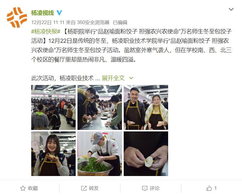 12月22日是传统的冬至,杨凌职业技术学院举行“品赵瑜面粉饺子 担强农兴农使命”万名师生冬至包饺子活动。虽然室外寒气袭人,但在学校南、西、北三个校区的餐厅里却是热闹非凡、温暖四溢。