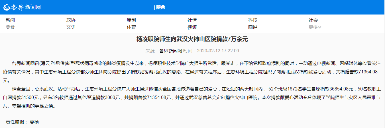 各界新闻网讯(海云 孙承俊)新型冠状病毒感染的肺炎疫情发生以来,杨凌职业技术学院广大师生听党话、跟党走,在不给党和政府添乱的同时,主动通过电视新闻、网络媒体等收看关注疫情有关情况,其中生态环境工程分院部分师生还向分院提出了捐款驰援湖北武汉的意愿。在通过有关程序后,生态环境工程分院组织了向湖北武汉捐款献爱心活动,共捐赠善款71354.08元。