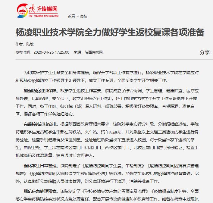 【西部网】杨凌职业技术学院全力做好学生返校复课各项准备