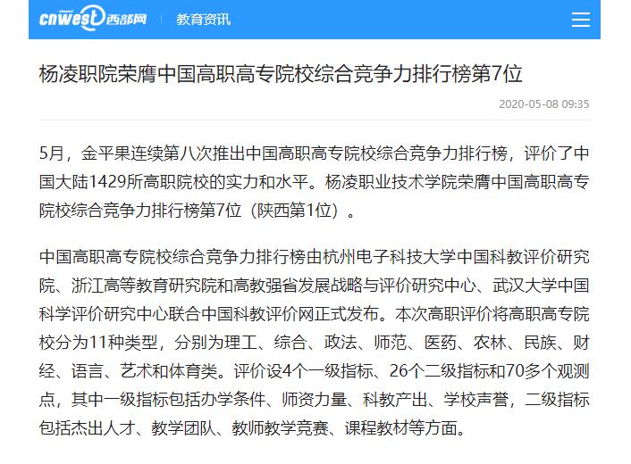 5月,金平果连续第八次推出中国高职高专院校综合竞争力排行榜,评价了中国大陆1429所高职院校的实力和水平。杨凌职业技术学院荣膺中国高职高专院校综合竞争力排行榜第7位(陕西第1位)。
