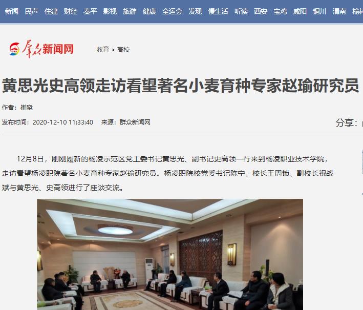 12月8日,刚刚履新的杨凌示范区党工委书记黄思光、副书记史高领一行来到杨凌职业技术学院,走访看望杨凌职院著名小麦育种专家赵瑜研究员。杨凌职院校党委书记陈宁、校长王周锁、副校长祝战斌与黄思光、史高领进行了座谈交流。
