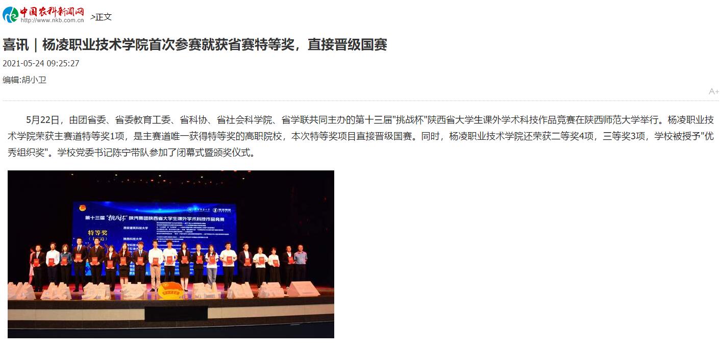 5月22日,由团省委、省委教育工委、省科协、省社会科学院、省学联共同主办的第十三届"挑战杯"陕西省大学生课外学术科技作品竞赛在陕西师范大学举行。杨凌职业技术学院荣获主赛道特等奖1项,是主赛道唯一获得特等奖的高职院校,本次特等奖项目直接晋级国赛。同时,杨凌职业技术学院还荣获二等奖4项,三等奖3项,学校被授予"优秀组织奖"。学校党委书记陈宁带队参加了闭幕式暨颁奖仪式。