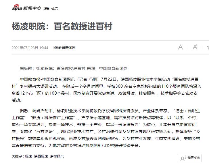 7月22日,陕西杨凌职业技术学院启动“百名教授进百村”乡村振兴大调研活动。 在随后一个多月时间里,学校300 余名专家教授组成的110个服务团队将深入全省12个市(区)的100个县村,因地制宜开展党史宣讲、政策解读、社会服务 、技术指导等支农助农活动。