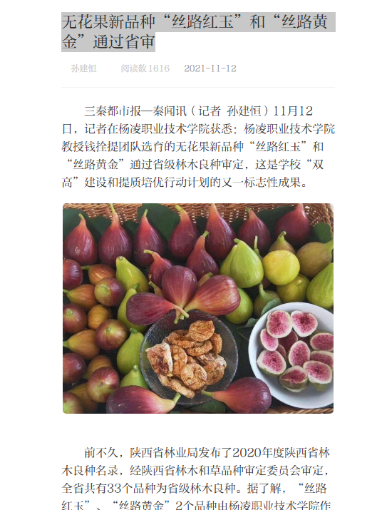 三秦都市报—秦闻讯(记者 孙建恒)11月12日,记者在杨凌职业技术学院获悉:杨凌职业技术学院教授钱拴提团队选育的无花果新品种“丝路红玉”和“丝路黄金”通过省级林木良种审定,这是学校“双高”建设和提质培优行动计划的又一标志性成果。