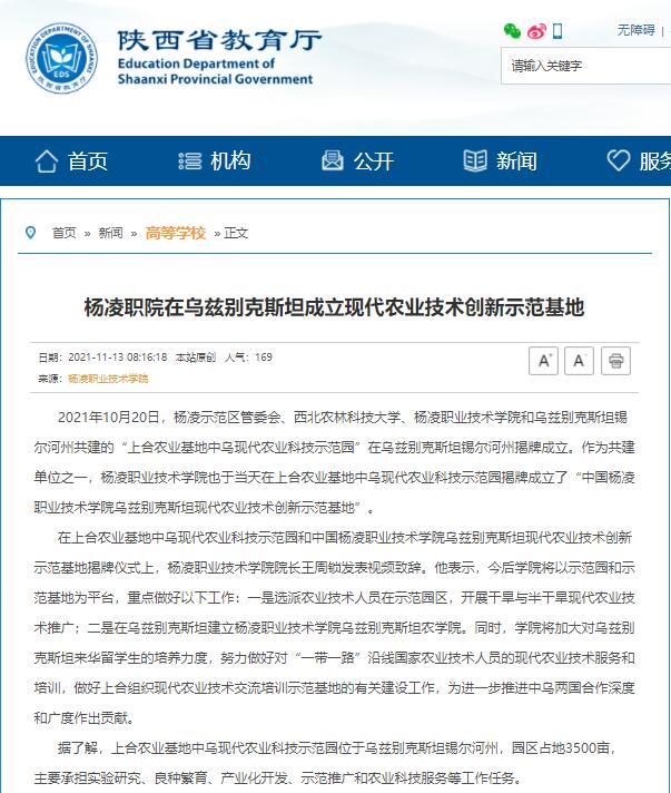 2021年10月20日,杨凌示范区管委会、西北农林科技大学、杨凌职业技术学院和乌兹别克斯坦锡尔河州共建的“上合农业基地中乌现代农业科技示范园”在乌兹别克斯坦锡尔河州揭牌成立。作为共建单位之一,杨凌职业技术学院也于当天在上合农业基地中乌现代农业科技示范园揭牌成立了“中国杨凌职业技术学院乌兹别克斯坦现代农业技术创新示范基地”。