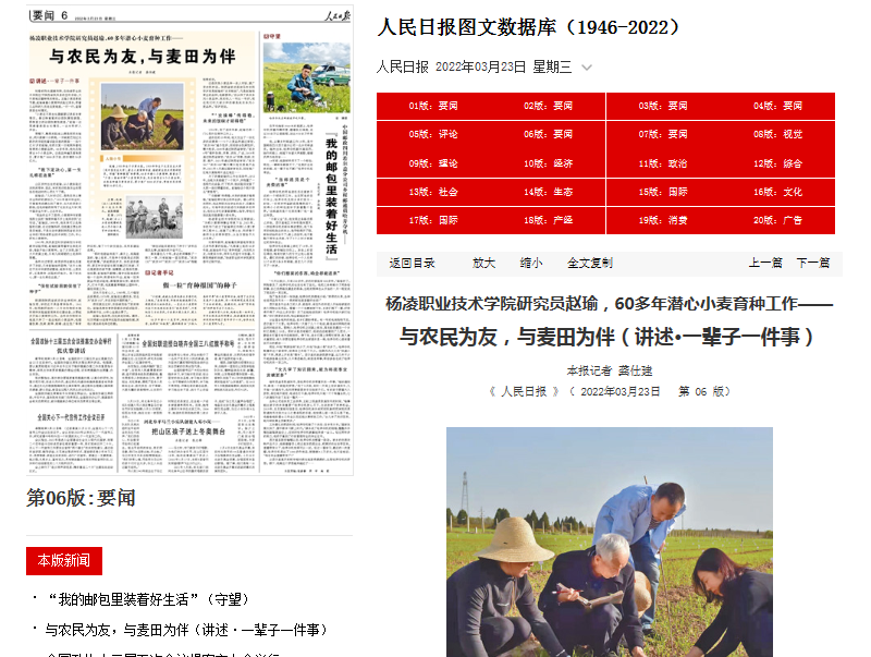 2022年3月22日,《人民日报》要闻版头条以《与农民为友,与麦田为伴》为题,长篇报道我校研究员赵瑜老师60多年潜心小麦育种工作事迹,并配发了记者手记。