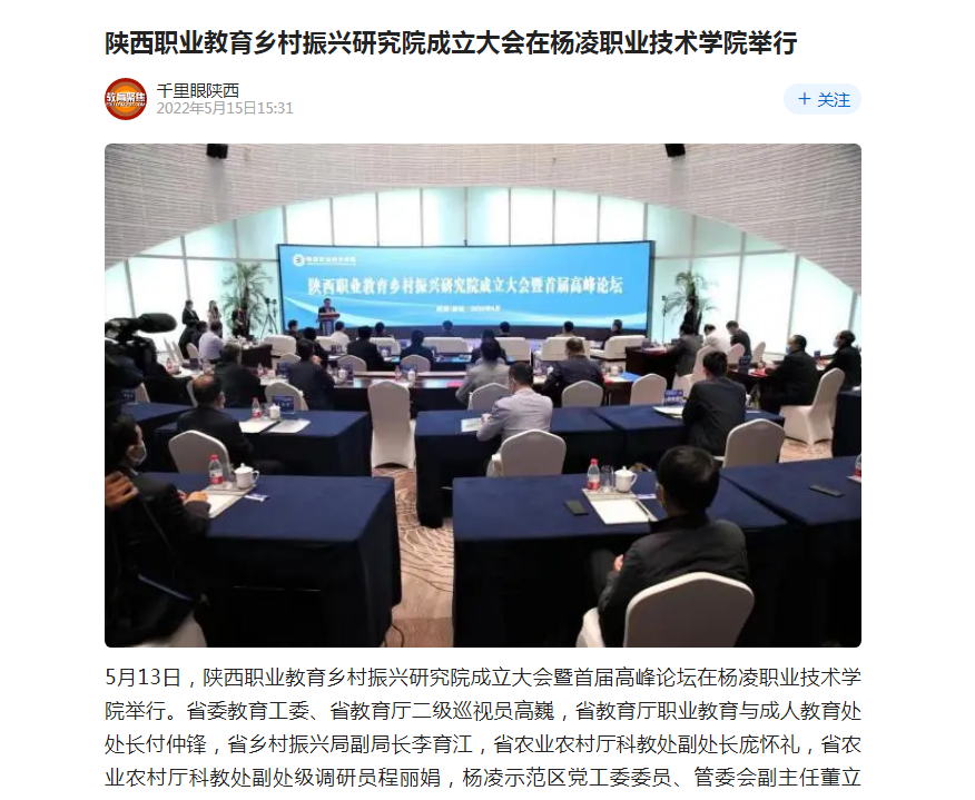 批复指出,陕西职业教育乡村振兴研究依托杨凌职业技术学院成立,为独立运行的学术研究机,陕西职业教育构,要面向“三农”,积极开展理论研究,构建“产教融合、科教协同、校际共享、校地一体”的运行机制。研究院要通过开展理论研究、咨询服务、学术交流等,探索职业教育服务乡村振兴战略新路径,创新职业教育产教融合新模式,努力将研究院打造为高水平理论研究基地,为提升职业教育服务乡村振兴战略和经济社会发展能力做出新的贡献。