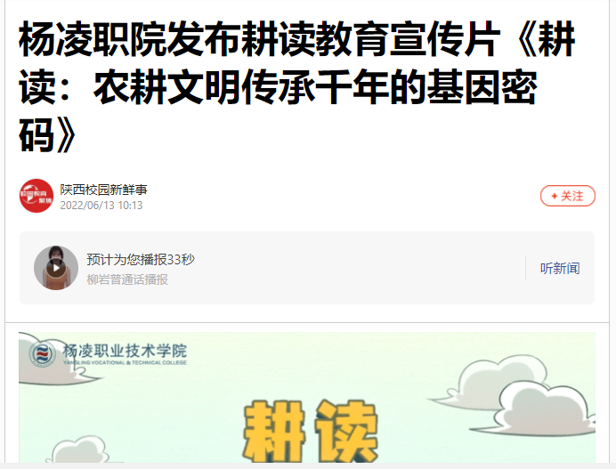 为贯彻落实教育部关于加强和改进涉农高校耕读教育工作方案,大力培养知农爱农新型人才,杨凌职院经过策划、制作,重磅发布动画宣传片《耕读:农耕文明传承千年的基因密码》,弘扬后稷文化,构建“力耕勤读”的全方位耕读教育体系,为乡村振兴赋能助力。
