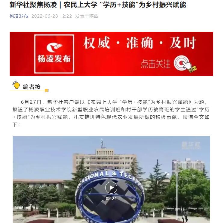 6月27日,新华社客户端以《农民上大学 “学历+技能”为乡村振兴赋能》为题,报道了杨凌职业技术学院新型职业农民培训班和村干部学历教育班的学生通过“学历+技能”为乡村振兴赋能,扎实推进特色现代农业发展所做的积极贡献。报道全文如下: