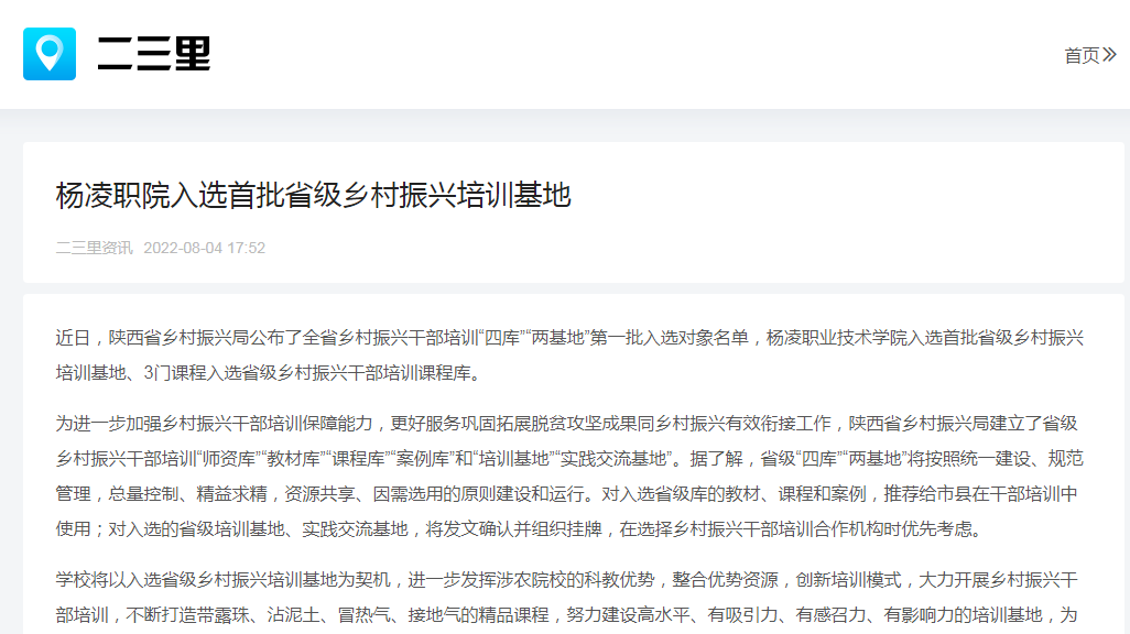 近日,陕西省乡村振兴局公布了全省乡村振兴干部培训“四库”“两基地”第一批入选对象名单,杨凌职业技术学院入选首批省级乡村振兴培训基地、3门课程入选省级乡村振兴干部培训课程库。