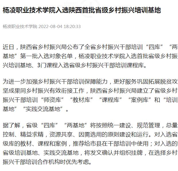 近日,陕西省乡村振兴局公布了全省乡村振兴干部培训“四库”“两基地”第一批入选对象名单,杨凌职业技术学院入选首批省级乡村振兴培训基地、3门课程入选省级乡村振兴干部培训课程库。
