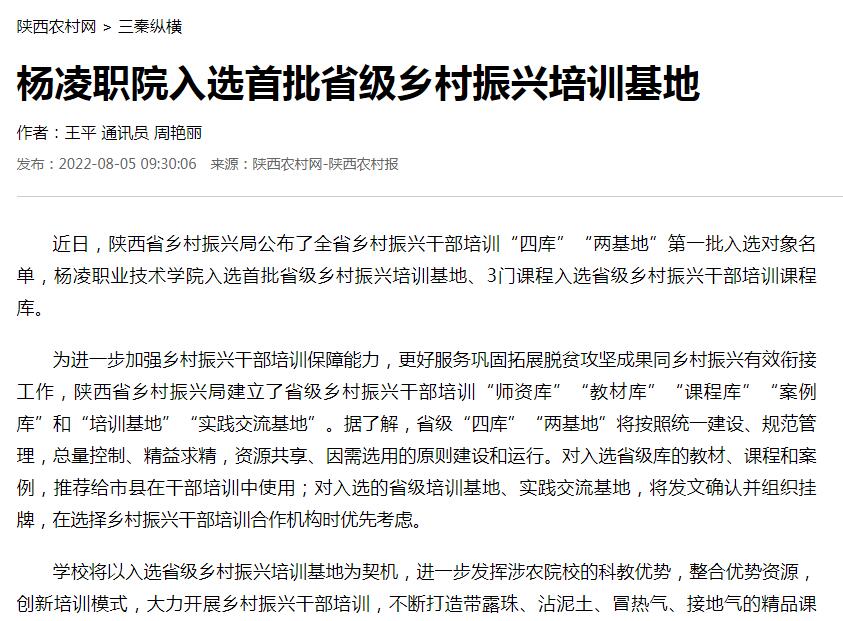 近日,陕西省乡村振兴局公布了全省乡村振兴干部培训“四库”“两基地”第一批入选对象名单,杨凌职业技术学院入选首批省级乡村振兴培训基地、3门课程入选省级乡村振兴干部培训课程库。