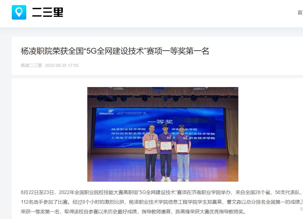 8月22日至23日,2022年全国职业院校技能大赛高职组“5G全网建设技术”赛项在济南职业学院举办,来自全国28个省、56支代表队、112名选手参加了比赛。经过8个小时的激烈比拼,杨凌职业技术学院信息工程学院学生郑嘉昊、曹文森以总分排名全国第一的成绩,荣获一等奖第一名,取得该校自参赛以来历史最好成绩,指导教师康晋、陈高锋荣获大赛优秀指导教师奖。