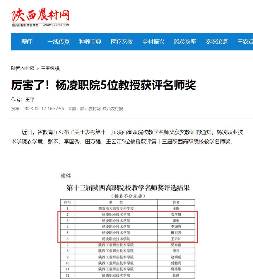 陕西高职院校教学名师奖是陕西高职院校优秀教师的重要奖项,是建设高水平师资队伍、全面落实立德树人根本任务的重要举措。本次全省共有49名教师获评陕西高职院校教学名师奖,杨凌职业技术学院获奖人数为历年来获评此类奖项最多。