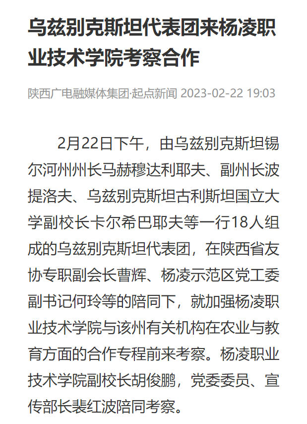 【起点新闻】乌兹别克斯坦代表团来杨凌职业技术学院考察合作