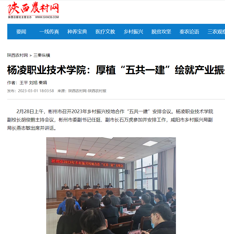 2月28日上午,彬州市召开2023年乡村振兴校地合作“五共一建”安排会议。杨凌职业技术学院副校长胡俊鹏主持会议,彬州市委副书记任挺、副市长石万虎参加并安排工作,咸阳市乡村振兴局副局长燕志敏出席并讲话。