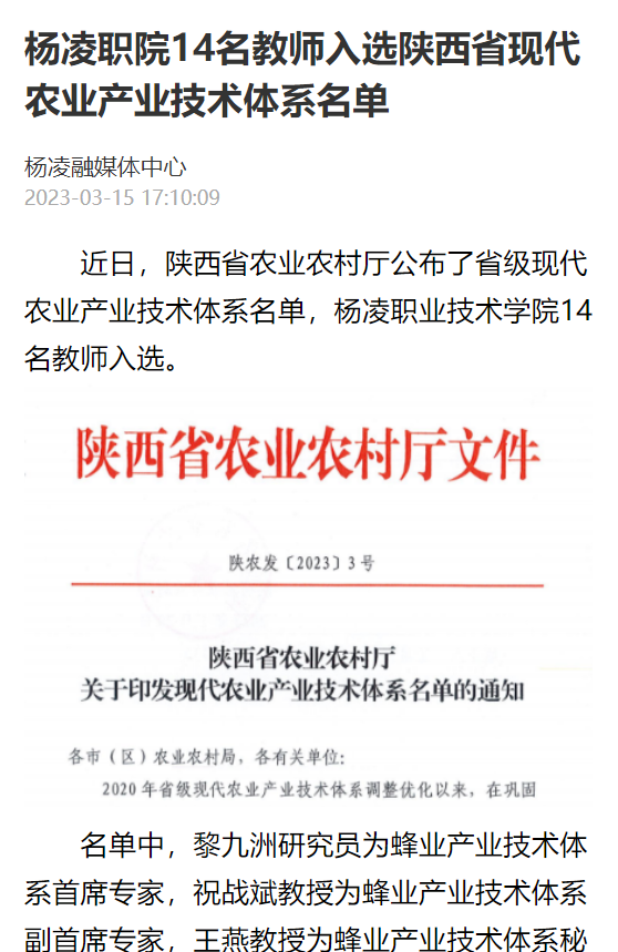 近日,陕西省农业农村厅公布了省级现代农业产业技术体系名单,杨凌职业技术学院14教师入选。