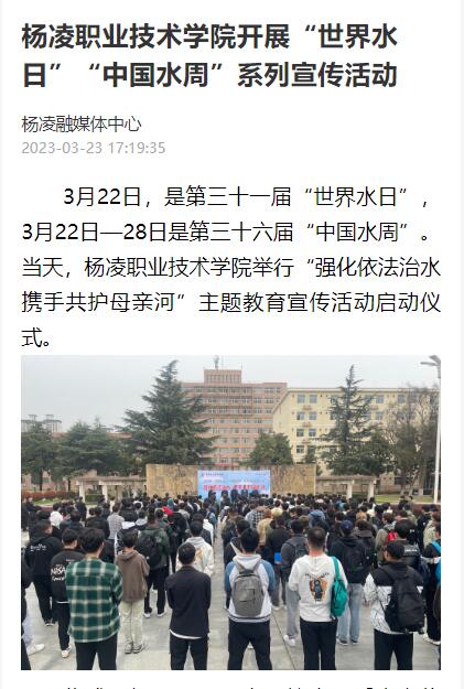 3月22日,是第三十一届“世界水日”,3月22日—28日是第三十六届“中国水周”。当天,杨凌职业技术学院举行“强化依法治水 携手共护母亲河”主题教育宣传活动启动仪式。