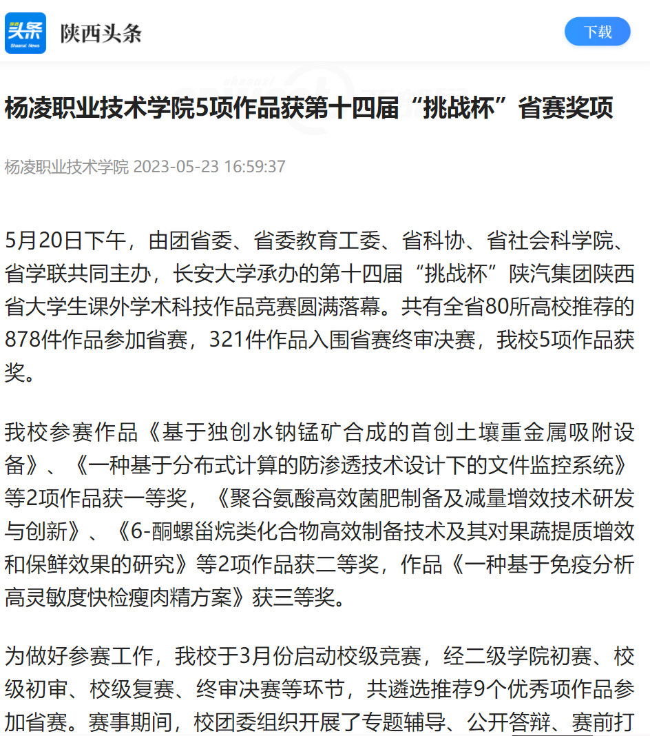 我校参赛作品《基于独创水钠锰矿合成的首创土壤重金属吸附设备》、《一种基于分布式计算的防渗透技术设计下的文件监控系统》等2项作品获一等奖,《聚谷氨酸高效菌肥制备及减量增效技术研发与创新》、《6-酮螺甾烷类化合物高效制备技术及其对果蔬提质增效和保鲜效果的研究》等2项作品获二等奖,作品《一种基于免疫分析高灵敏度快检瘦肉精方案》获三等奖。