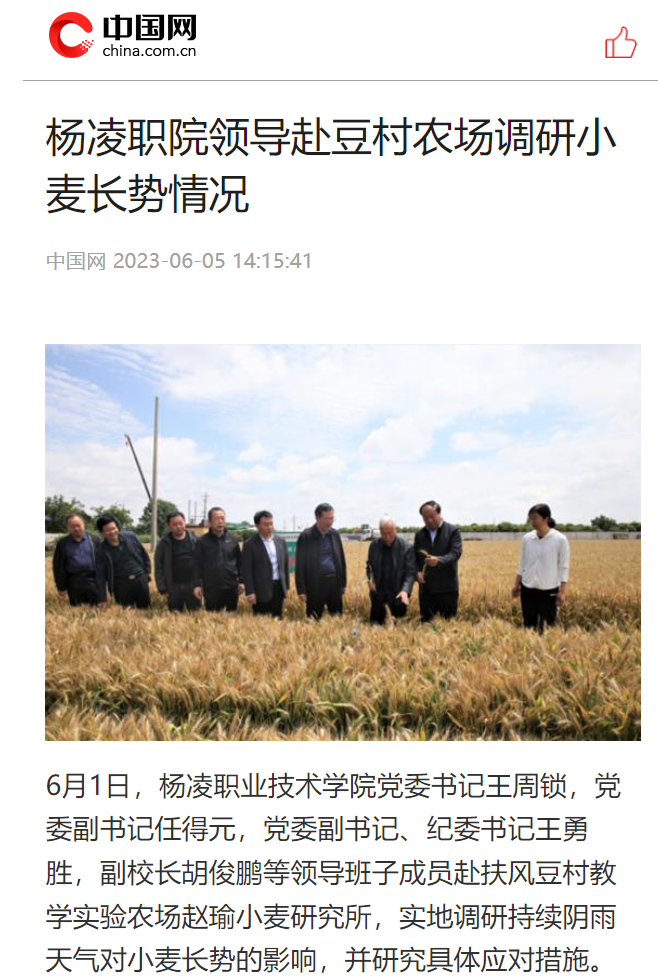 6月1日,杨凌职业技术学院党委书记王周锁,党委副书记任得元,党委副书记、纪委书记王勇胜,副校长胡俊鹏等领导班子成员赴扶风豆村教学实验农场赵瑜小麦研究所,实地调研持续阴雨天气对小麦长势的影响,并研究具体应对措施。党委委员、组织部部长田争运,党委委员、宣传部部长裴红波,科技与教育研究处处长冯旭,基地办主任王稳江等陪同调研。
